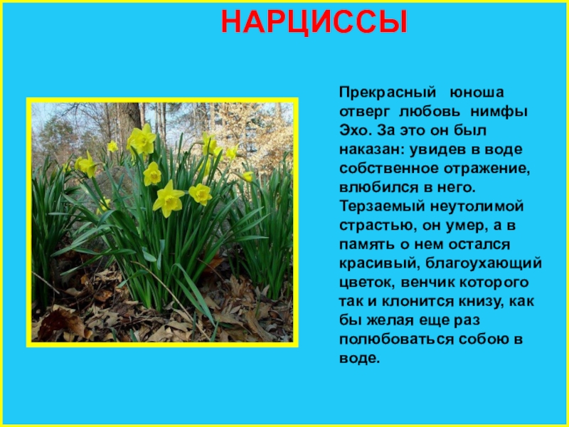 Прекрасный юноша отверг любовь нимфы Эхо. За это он был наказан: увидев в воде собственное отражение, влюбился в него. Терзаемый неутолимой страстью, он умер, а в память о нем остался красивый, благоухающий цветок, венчик которого так и клонится книзу, как бы желая еще раз полюбоваться собою в воде.