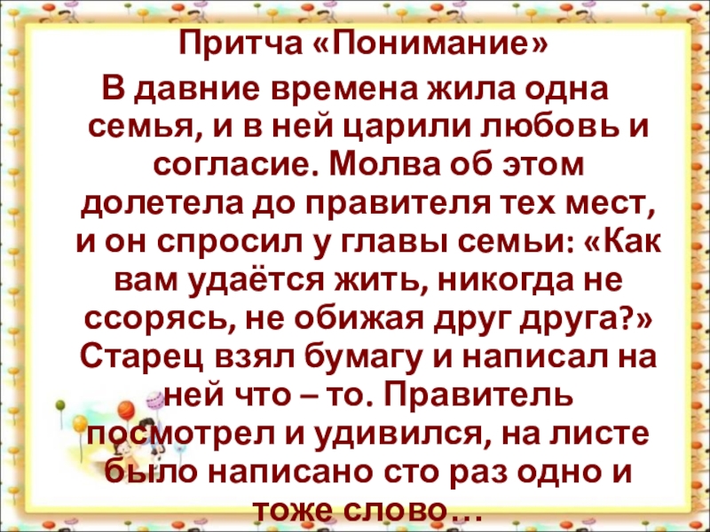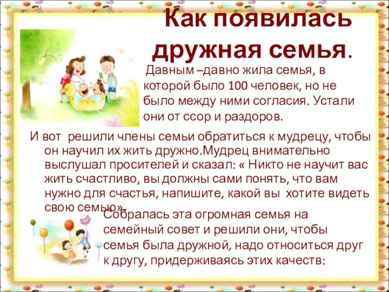 Давным –давно жила семья, в которой было 100 человек, но не было между ними согласия. Устали они от ссор и раздоров.