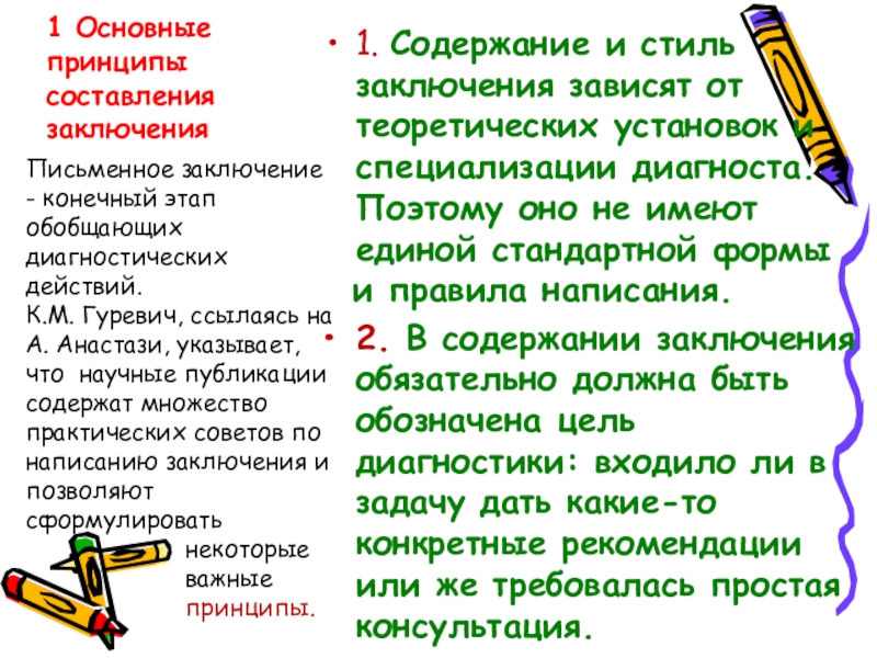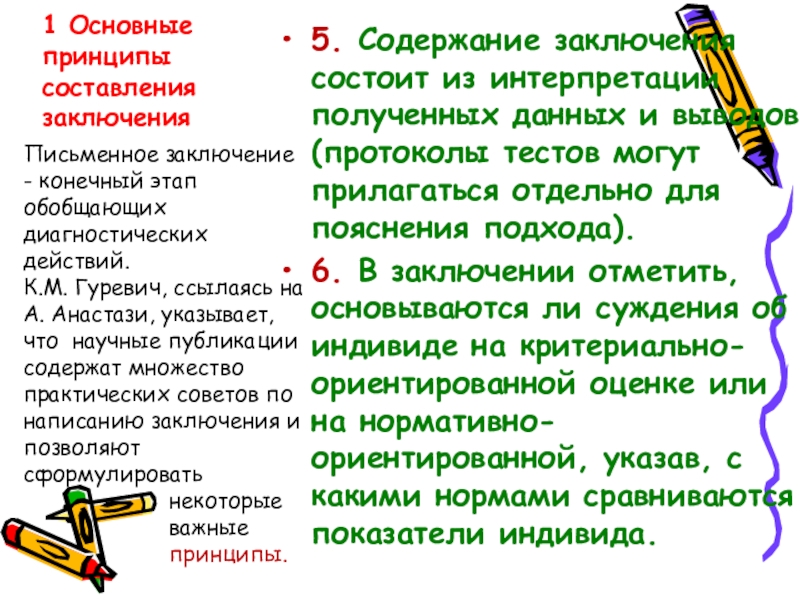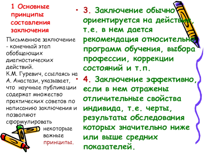 К.М. Гуревич, ссылаясь на А. Анастази, указывает, что научные публикации содержат множество практических советов по написанию заключения и позволяют сформулировать