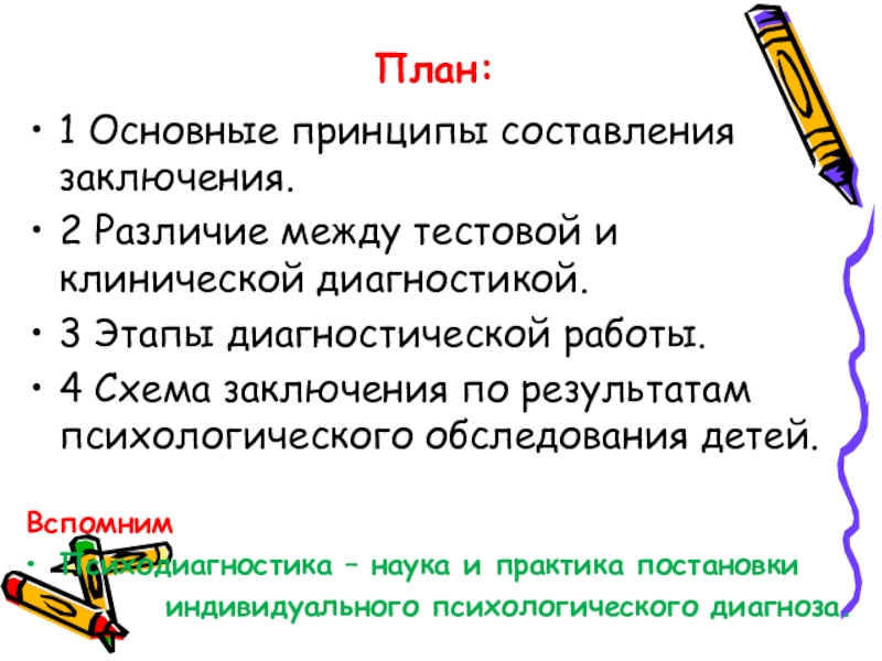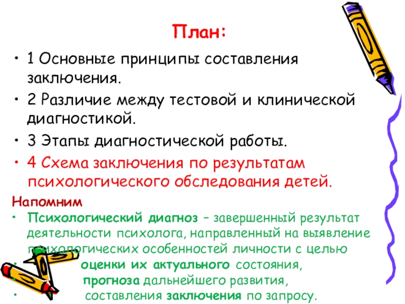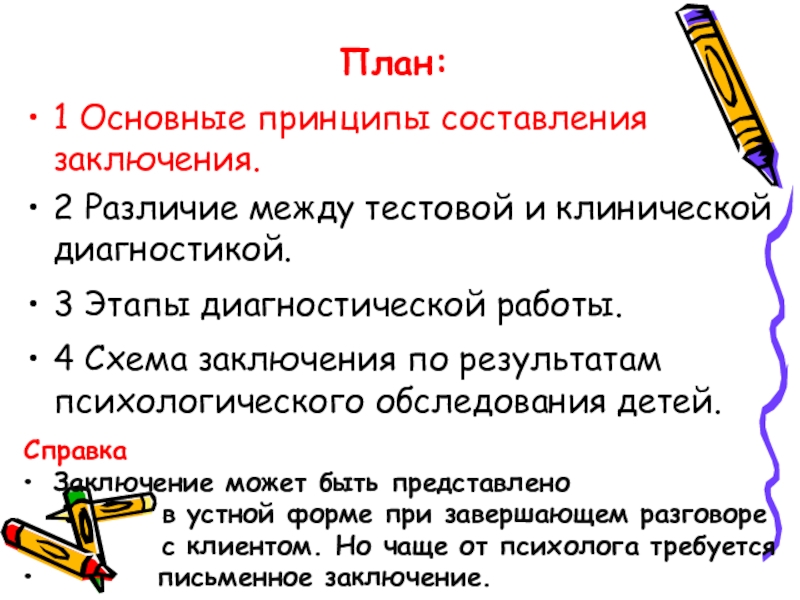 2. В содержании заключения обязательно должна быть обозначена цель диагностики: входило ли в задачу дать какие-то конкретные рекомендации или же требовалась простая консультация.