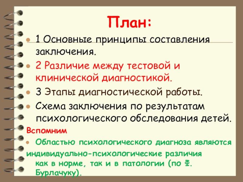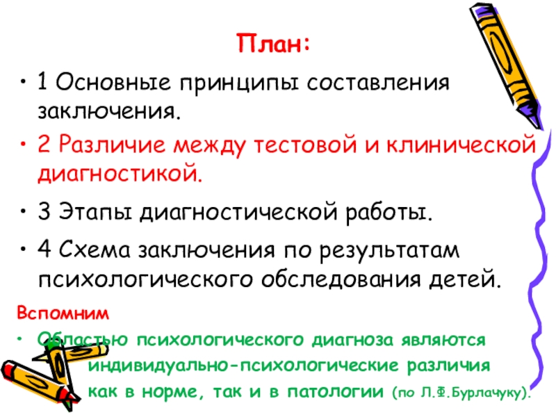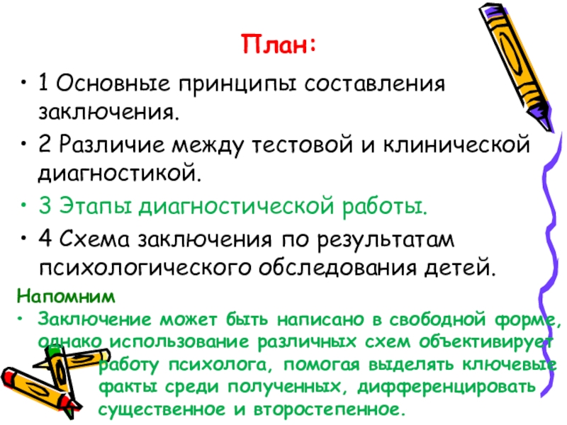 4. Заключение эффективно, если в нем отражены отличительные свойства индивида, т.е. черты, результаты обследования которых значительно ниже или выше средних показателей.