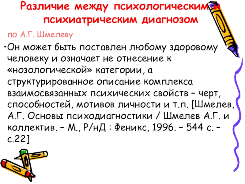 любому здоровому человеку и означает не отнесение к «нозологической» категории, а структурированное описание комплекса взаимосвязанных психических свойств – черт, способностей, мотивов личности и т.п. [Шмелев, А.Г. Основы психодиагностики / Шмелев А.Г. и коллектив. – М., Р/нД : Феникс, 1996. – 544 с. – с.22]
