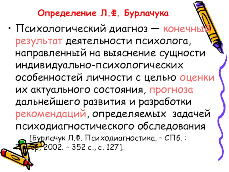 [Бурлачук Л.Ф. Психодиагностика. – СПб. : Питер, 2002. – 352 с., с. 127].