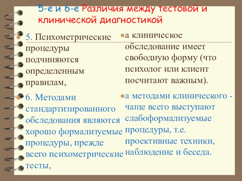 Клиническое обследование, берущее свое начало из психиатрии, не имеет строго определенного набора вопросов, а способы интерпретации ответов определяются концептуальными подходами и интуицией психолога.
