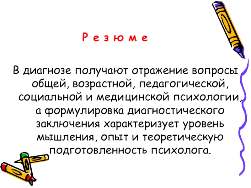 возрастной, педагогической, социальной и медицинской психологии, а формулировка диагностического заключения характеризует уровень мышления, опыт и теоретическую подготовленность психолога.