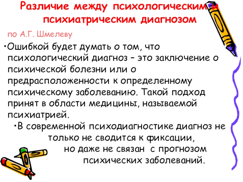 Слайд 38Различие между психологическим и психиатрическим диагнозом