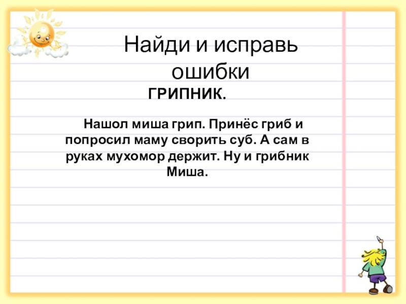 Найди и исправь ошибкиГРИПНИК.   Нашол миша грип. Принёс гриб и попросил маму сворить суб. А сам