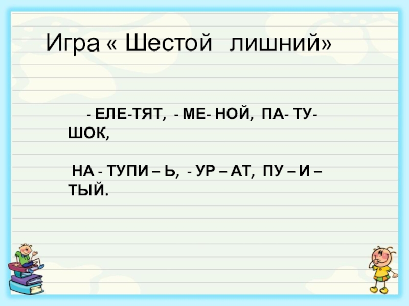 Игра « Шестой  лишний»    - ЕЛЕ-ТЯТ, - МЕ- НОЙ, ПА- ТУ- ШОК,