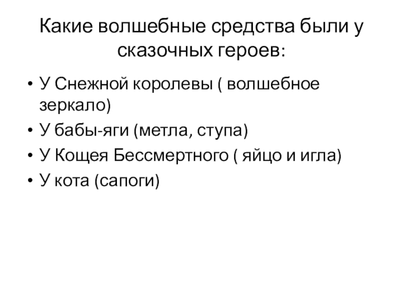 Какие волшебные средства были у сказочных героев:У Снежной королевы ( волшебное зеркало)У бабы-яги (метла, ступа)У Кощея Бессмертного