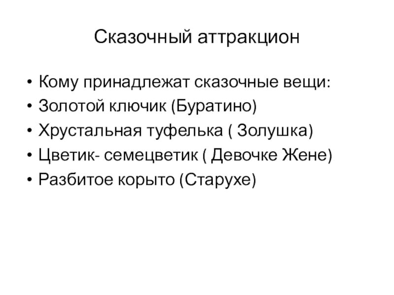 Сказочный аттракционКому принадлежат сказочные вещи:Золотой ключик (Буратино)Хрустальная туфелька ( Золушка)Цветик- семецветик ( Девочке Жене)Разбитое корыто (Старухе)