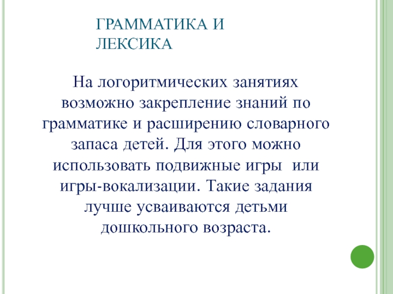 грамматике и расширению словарного запаса детей. Для этого можно использовать подвижные игры или игры-вокализации. Такие задания лучше усваиваются детьми дошкольного возраста.