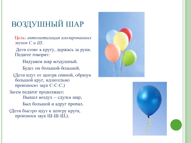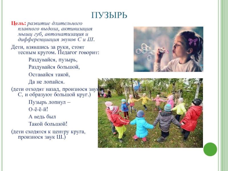 Цель: развитие длительного плавного выдоха, активизация мышц губ, автоматизация и дифференциация звуков С и Ш.