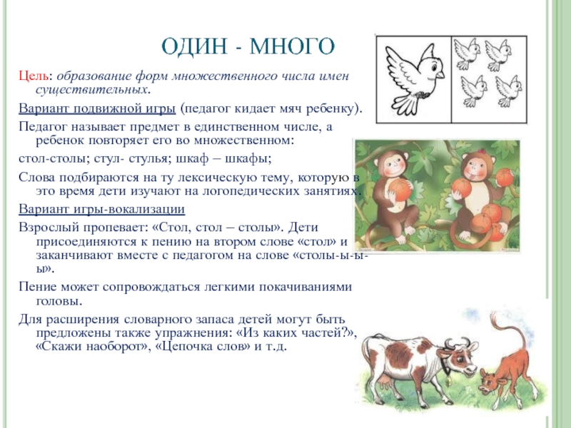 Педагог называет предмет в единственном числе, а ребенок повторяет его во множественном: