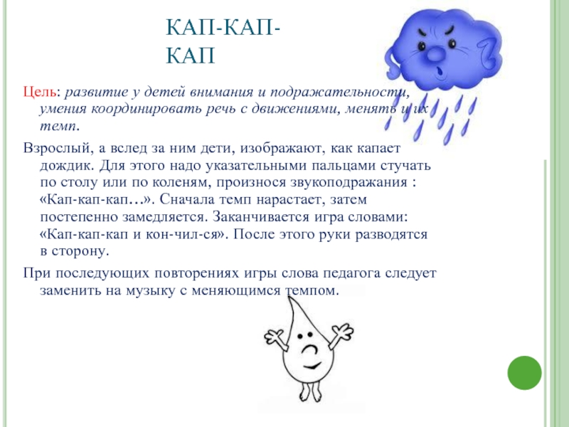 Взрослый, а вслед за ним дети, изображают, как капает дождик. Для этого надо указательными пальцами стучать по столу или по коленям, произнося звукоподражания : «Кап-кап-кап…». Сначала темп нарастает, затем постепенно замедляется. Заканчивается игра словами: «Кап-кап-кап и кон-чил-ся». После этого руки разводятся в сторону.