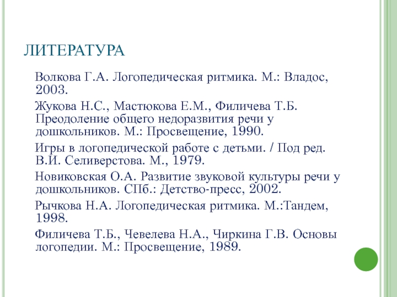 Волкова Г.А. Логопедическая ритмика. М.: Владос, 2003.