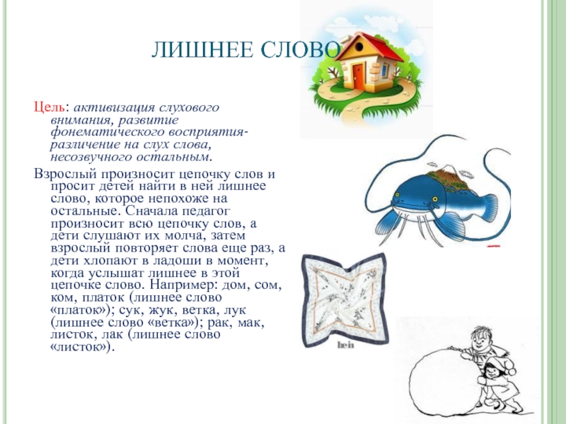Взрослый произносит цепочку слов и просит детей найти в ней лишнее слово, которое непохоже на остальные. Сначала педагог произносит всю цепочку слов, а дети слушают их молча, затем взрослый повторяет слова еще раз, а дети хлопают в ладоши в момент, когда услышат лишнее в этой цепочке слово. Например: дом, сом, ком, платок (лишнее слово «платок»); сук, жук, ветка, лук (лишнее слово «ветка»); рак, мак, листок, лак (лишнее слово «листок»).