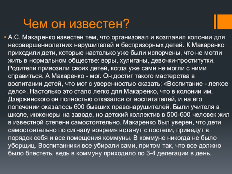 Чем он известен?А.С. Макаренко известен тем, что организовал и возглавил колонии для несовершеннолетних нарушителей и беспризорных детей.