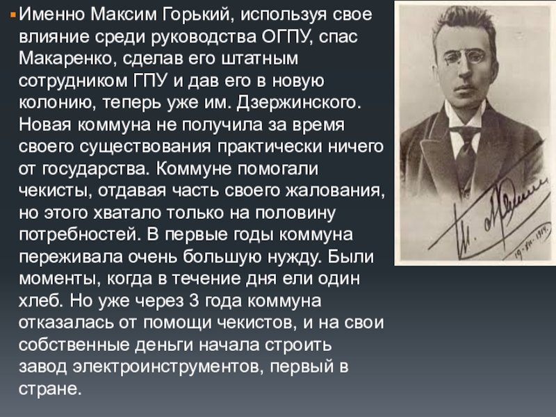 Слайд 6Именно Максим Горький, используя свое влияние среди руководства ОГПУ, спас Макаренко,