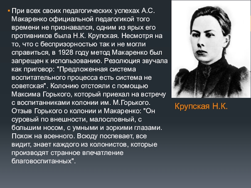 Крупская Н.К.При всех своих педагогических успехах А.С. Макаренко официальной педагогикой того времени не признавался, одним из ярых