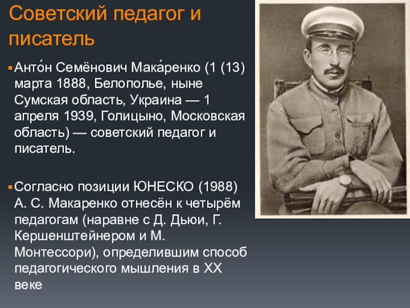 Советский педагог и писательАнто́н Семёнович Мака́ренко (1 (13) марта 1888, Белополье, ныне Сумская область, Украина — 1