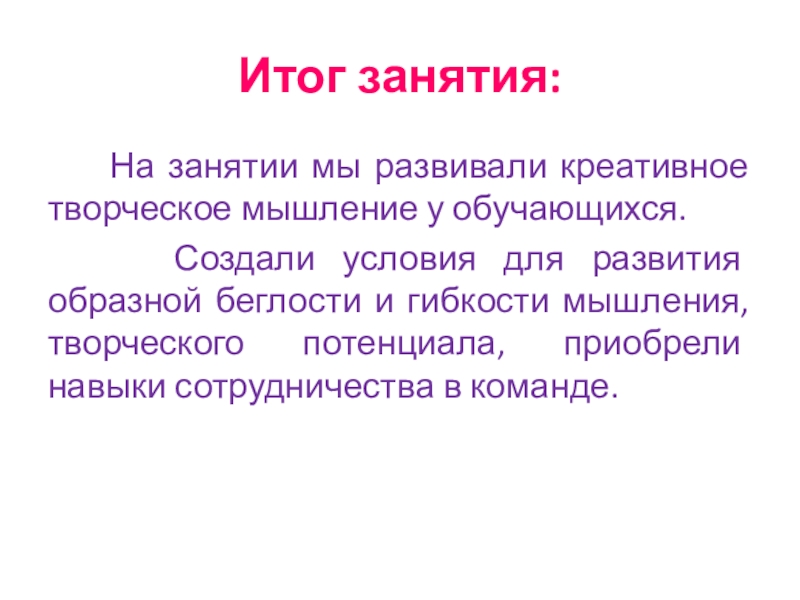 Создали условия для развития образной беглости и гибкости мышления, творческого потенциала, приобрели навыки сотрудничества в команде.