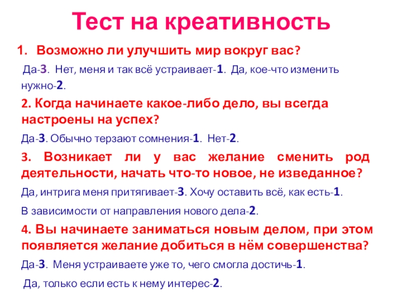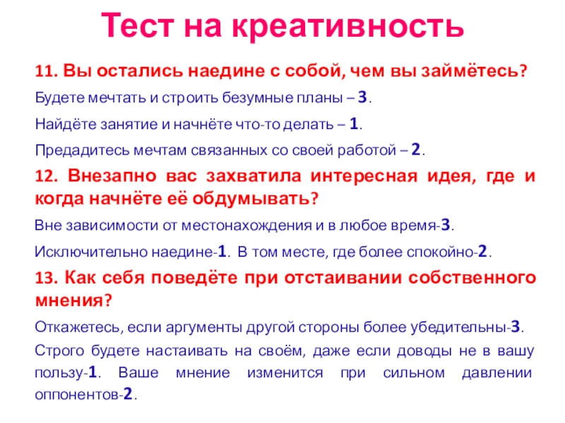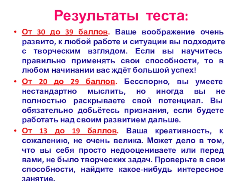 От 13 до 19 баллов. Ваша креативность, к сожалению, не очень велика. Может дело в том, что вы себя просто недооцениваете или перед вами, не было творческих задач. Проверьте в свои способности, найдите какое-нибудь интересное занятие.