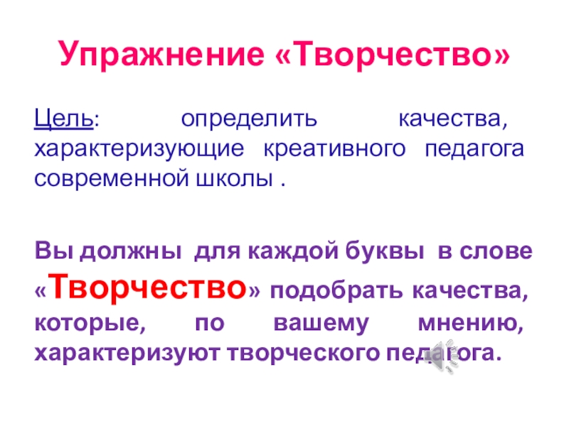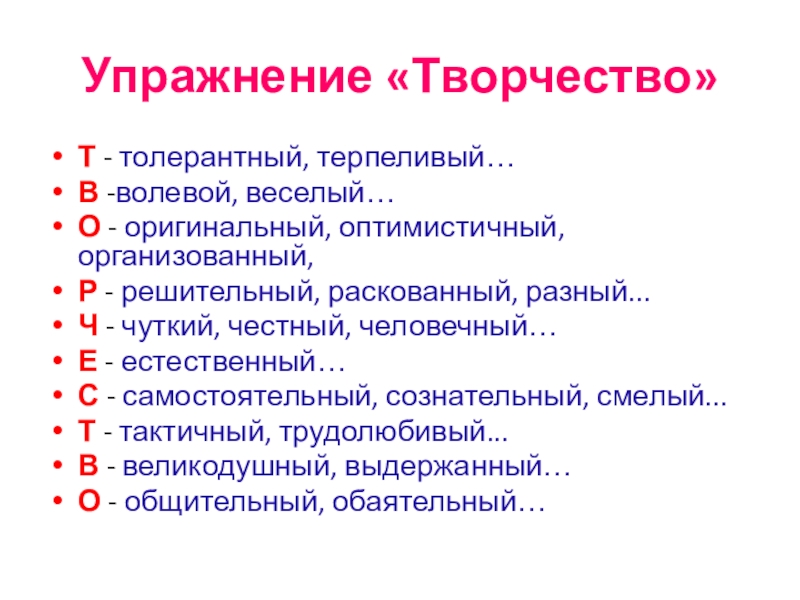 для каждой буквы в слове «Творчество» подобрать качества, которые, по вашему мнению, характеризуют творческого педагога.