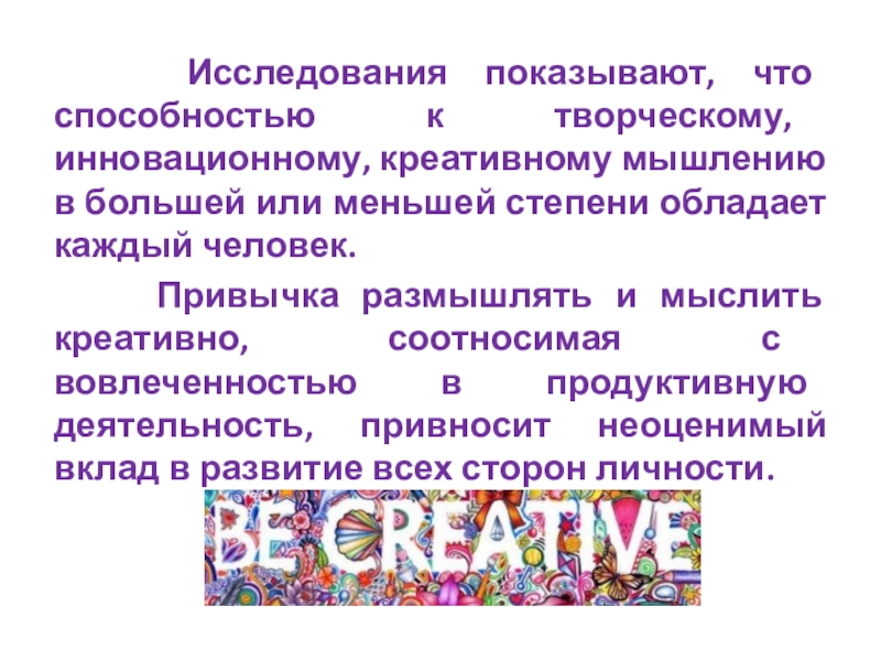 Слайд 5 Исследования показывают, что способностью к творческому, инновационному, креативному мышлению