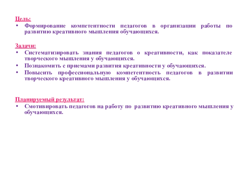 Повысить профессиональную компетентность педагогов в развитии творческого креативного мышления у обучающихся.