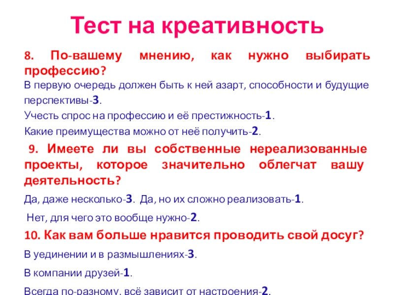 От 20 до 29 баллов. Бесспорно, вы умеете нестандартно мыслить, но иногда вы не полностью раскрываете свой потенциал. Вы обязательно добьётесь признания, если будете работать над своим развитием дальше.