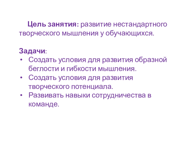 Слайд 10 Цель занятия: развитие нестандартного творческого мышления у обучающихся.