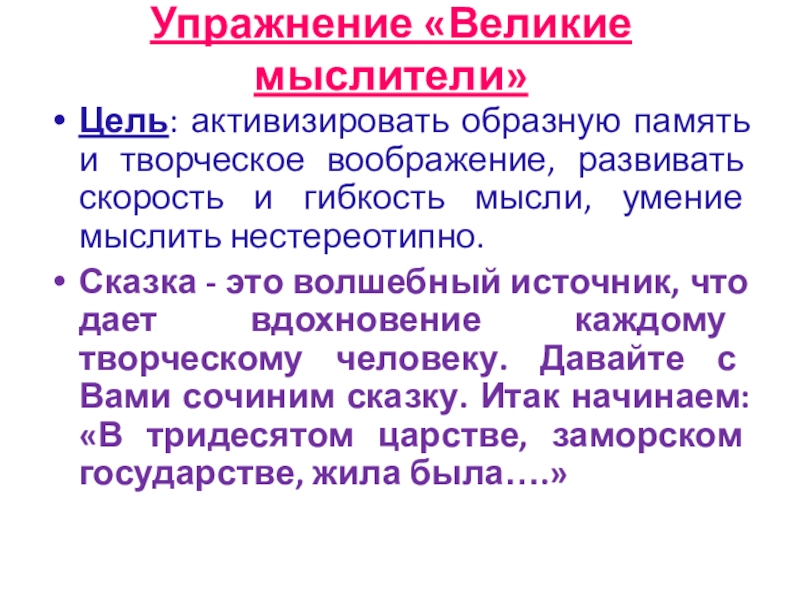 Сказка - это волшебный источник, что дает вдохновение каждому творческому человеку. Давайте с Вами сочиним сказку. Итак начинаем: «В тридесятом царстве, заморском государстве, жила была….»