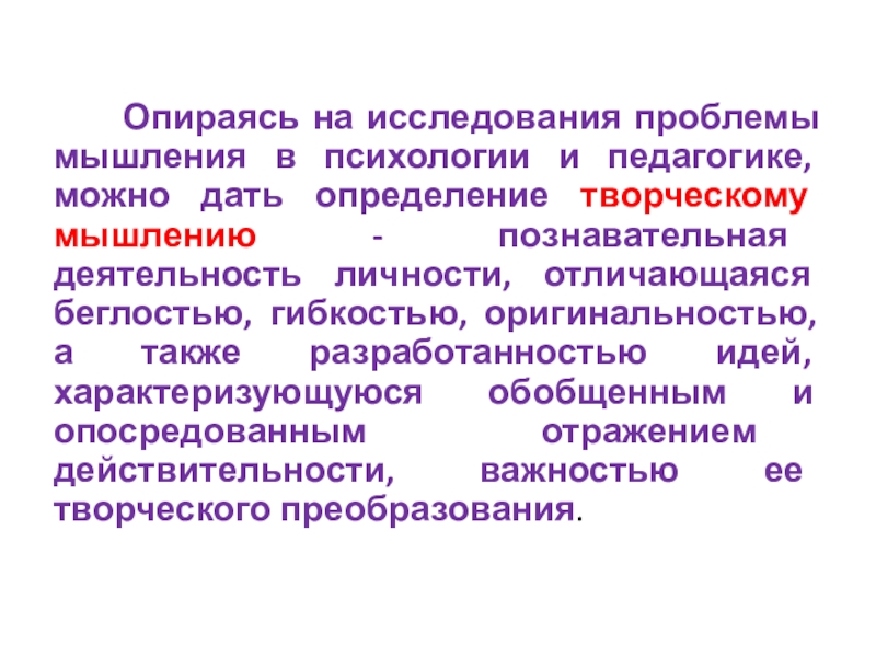 педагогике, можно дать определение творческому мышлению - познавательная деятельность личности, отличающаяся беглостью, гибкостью, оригинальностью, а также разработанностью идей, характеризующуюся обобщенным и опосредованным отражением действительности, важностью ее творческого преобразования.