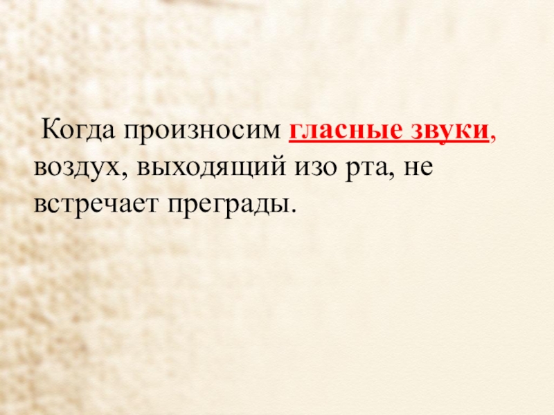 Слайд 5 Когда произносим гласные звуки, воздух, выходящий изо рта, не встречает