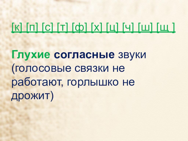 Глухие согласные звуки (голосовые связки не работают, горлышко не дрожит)