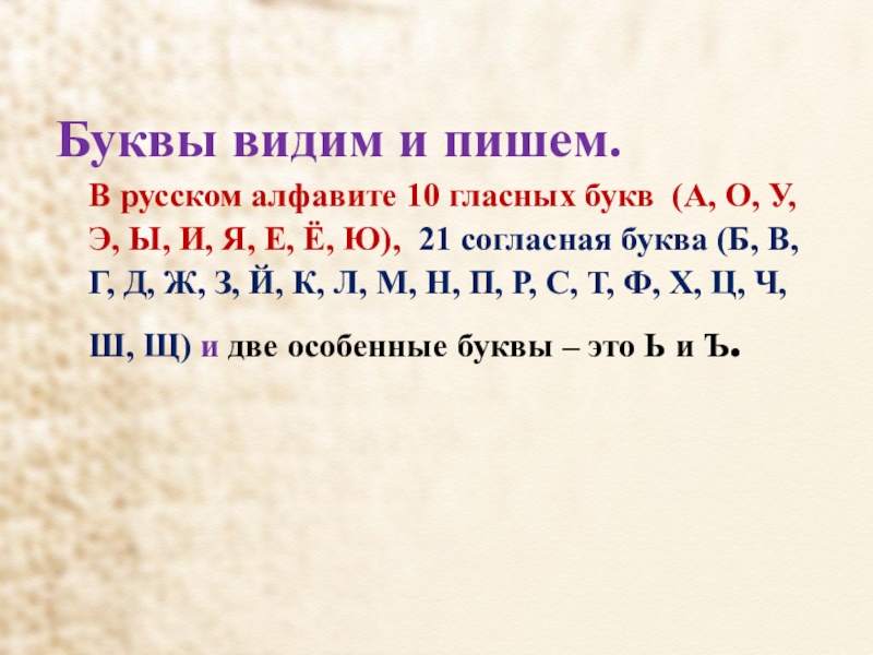 У, Э, Ы, И, Я, Е, Ё, Ю), 21 согласная буква (Б, В, Г, Д, Ж, З, Й, К, Л, М, Н, П, Р, С, Т, Ф, Х, Ц, Ч, Ш, Щ) и две особенные буквы – это Ь и Ъ.