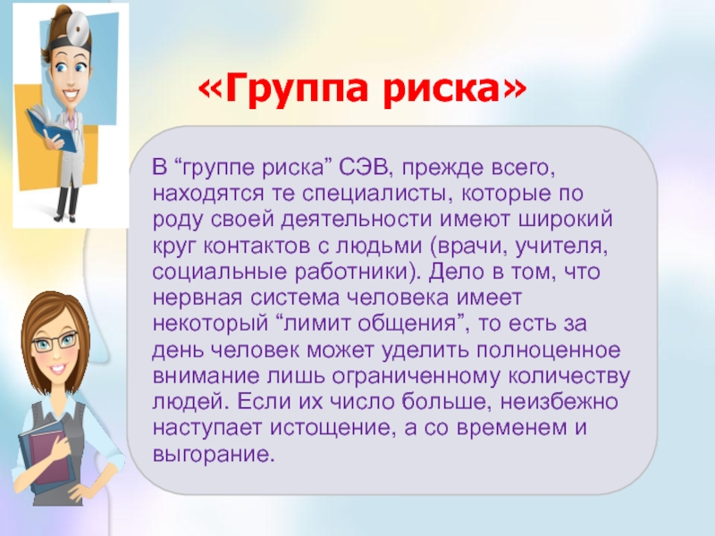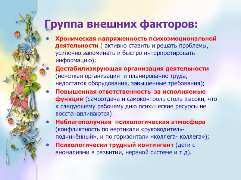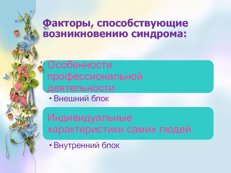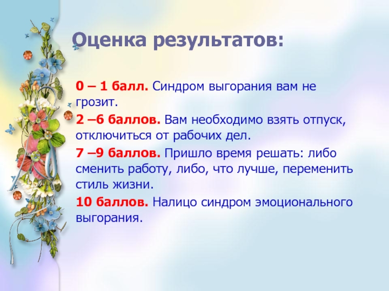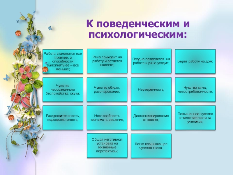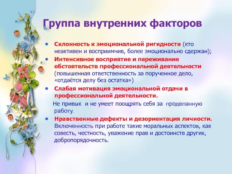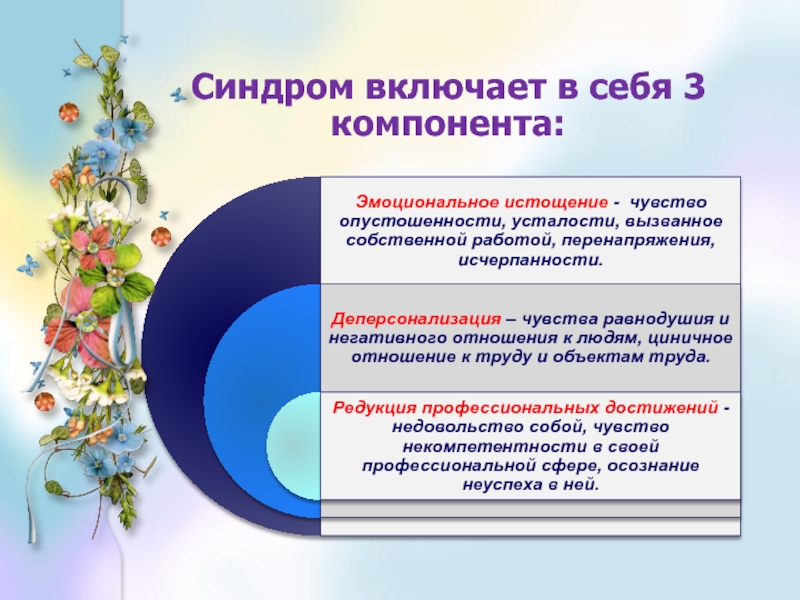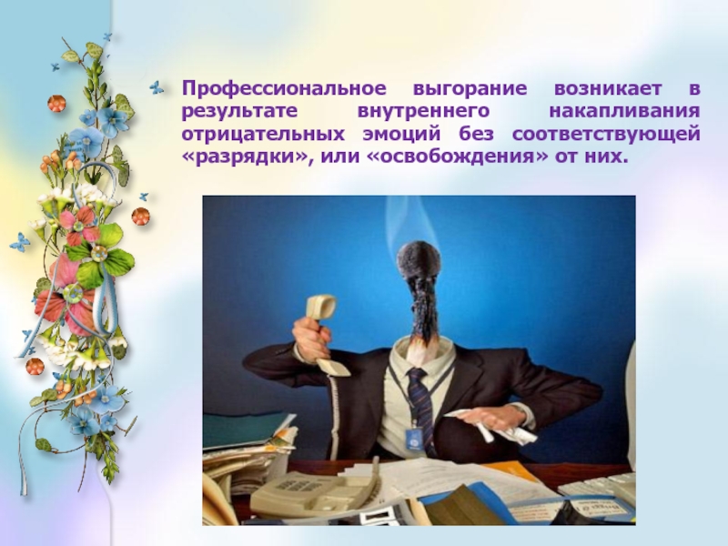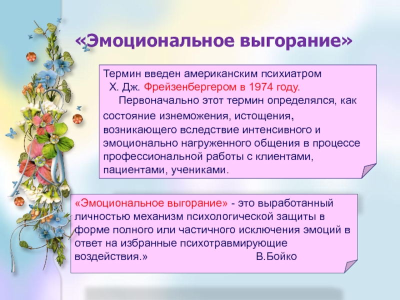 «Эмоциональное выгорание» - это выработанный личностью механизм психологической защиты в форме полного или частичного исключения эмоций в ответ на избранные психотравмирующие воздействия.» В.Бойко