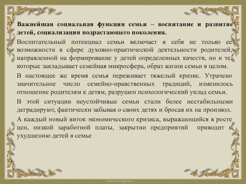 Слайд 3Важнейшая социальная функция семьи – воспитание и развитие детей, социализация подрастающего