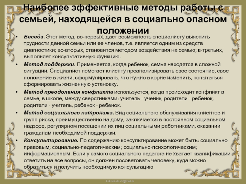Слайд 17Наиболее эффективные методы работы с семьей, находящейся в социально опасном положении
