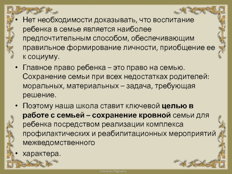 Главное право ребенка – это право на семью. Сохранение семьи при всех недостатках родителей: моральных, материальных – задача, требующая решение.
