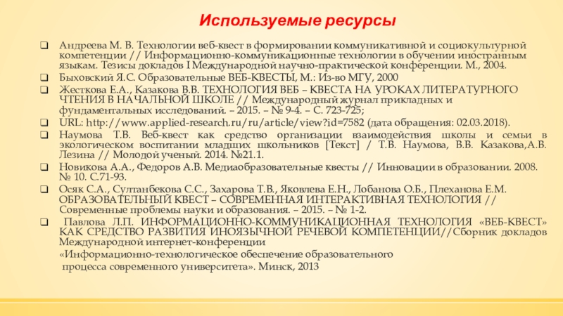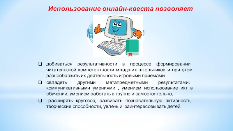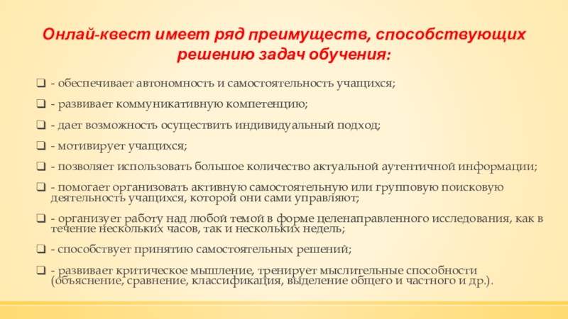 Онлай-квест имеет ряд преимуществ, способствующих решению задач обучения: