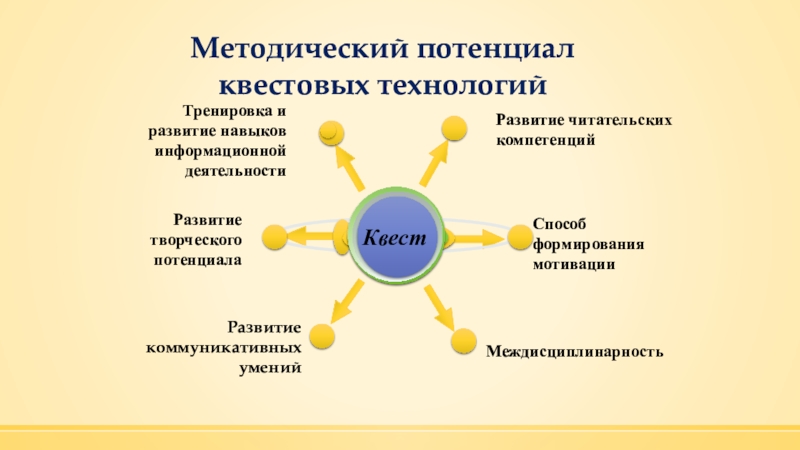 Квест – это разновидность игр, требующих от игрока решения умственных задач для продвижения по сюжету. Квест в педагогике – это выполнение проблемного задания с элементами игры . (Быховский Я.С.)
