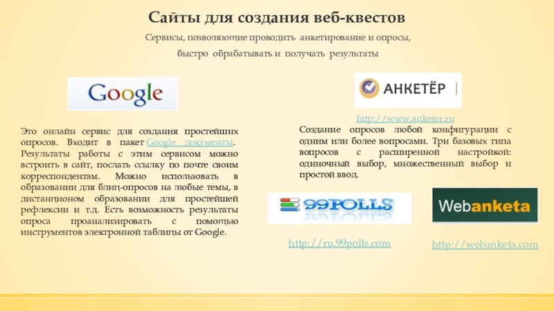 Это онлайн сервис для создания простейших опросов. Входит в пакет Google документы. Результаты работы с этим сервисом можно встроить в сайт, послать ссылку по почте своим корреспондентам. Можно использовать в образовании для блиц-опросов на любые темы, в дистанционом образовании для простейшей рефлексии и т.д. Есть возможность результаты опроса проанализировать с помощью инструментов электронной таблицы от Google.