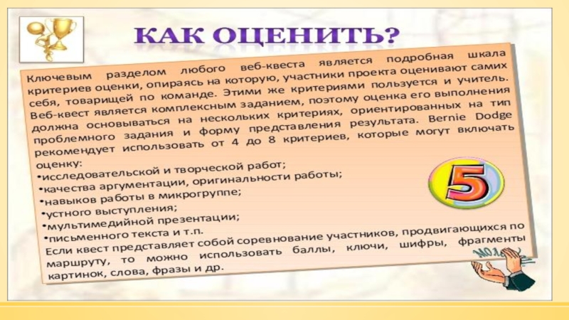 Веб-квест (дословно с английского «поиск в сети интернет») — это деятельностно-ориентированная проектная дидактическая модель, предусматривающая самостоятельную поисковую работу учащихся в сети Интернет(Берни Додж (Bernie Dodge) и Том Марч (Tom March)