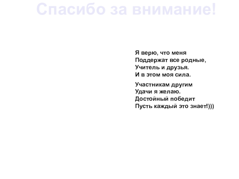 Спасибо за внимание!Я верю, что меняПоддержат все родные,Учитель и друзья.И в этом моя сила.Участникам другимУдачи я желаю.Достойный