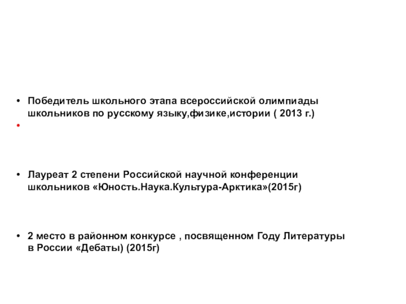 Победитель школьного этапа всероссийской олимпиады школьников по русскому языку,физике,истории ( 2013 г.)