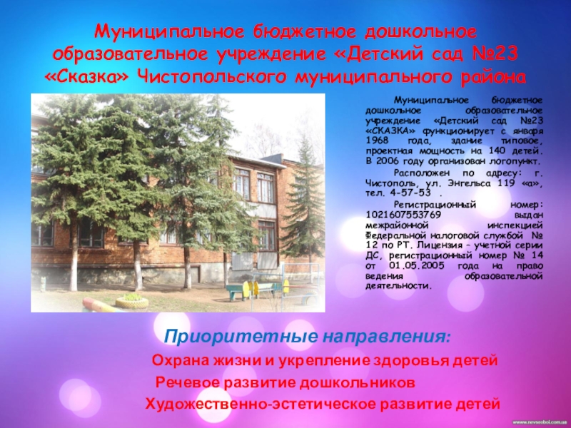 Регистрационный номер: 1021607553769 выдан межрайонной инспекцией Федеральной налоговой службой № 12 по РТ. Лицензия – учетной серии ДС, регистрационный номер № 14 от 01.05.2005 года на право ведения образовательной деятельности.