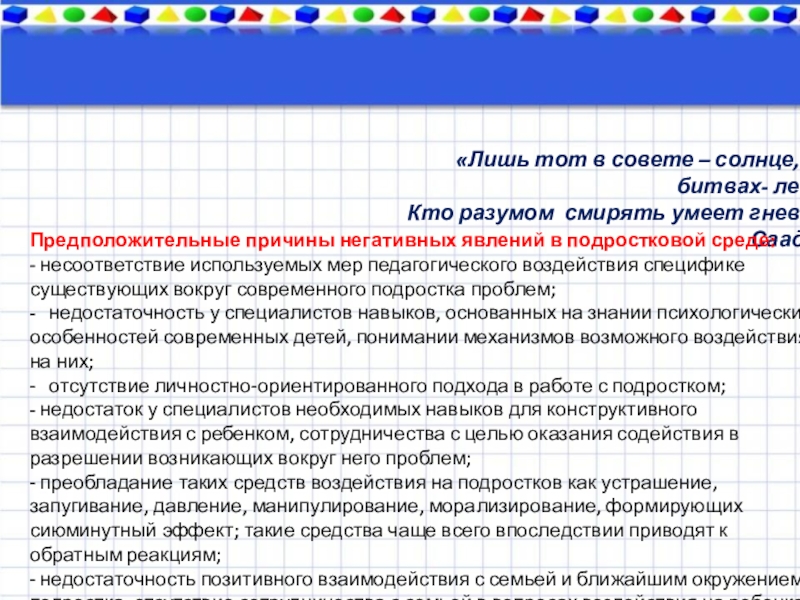 - несоответствие используемых мер педагогического воздействия специфике существующих вокруг современного подростка проблем;