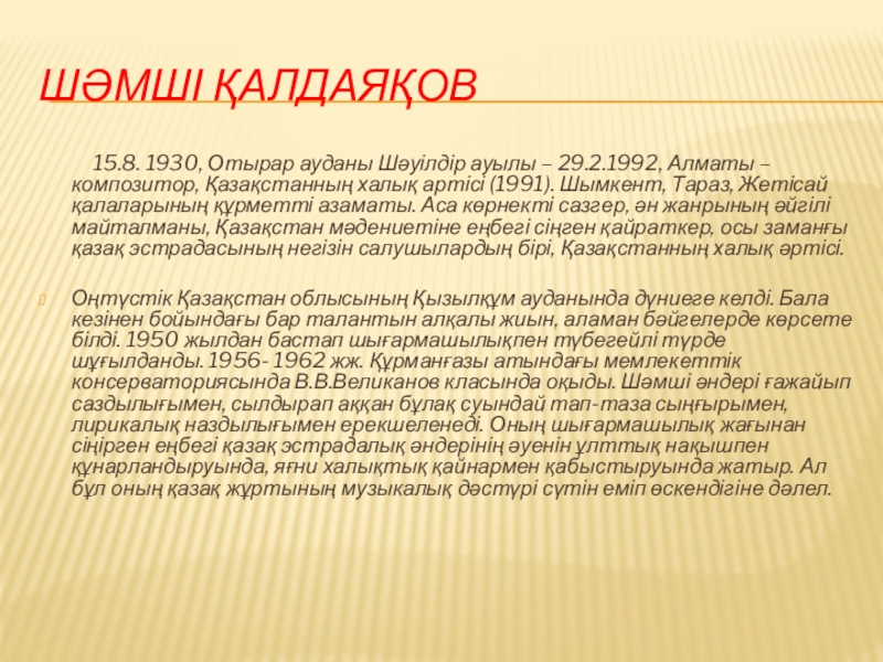 Шәуілдір ауылы – 29.2.1992, Алматы – композитор, Қазақстанның халық артісі (1991). Шымкент, Тараз, Жетісай қалаларының құрметті азаматы. Аса көрнекті сазгер, ән жанрының әйгілі майталманы, Қазақстан мәдениетіне еңбегі сіңген қайраткер, осы заманғы қазақ эстрадасының негізін салушылардың бірі, Қазақстанның халық әртісі.