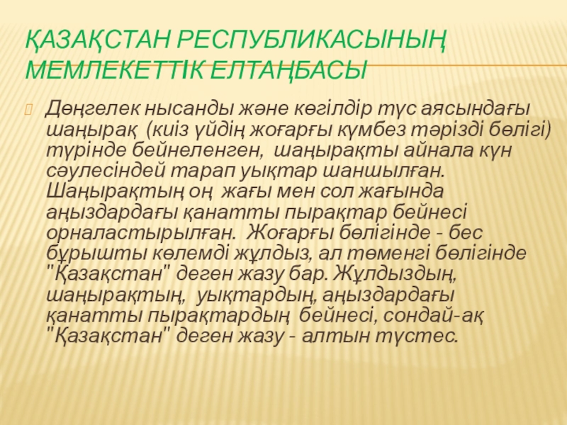 үйдiң жоғарғы күмбез тәрiздi бөлiгi) түрiнде бейнеленген, шаңырақты айнала күн сәулесiндей тарап уықтар шаншылған. Шаңырақтың оң жағы мен сол жағында аңыздардағы қанатты пырақтар бейнесi орналастырылған. Жоғарғы бөлiгiнде - бес бұрышты көлемдi жұлдыз, ал төменгi бөлiгiнде "Қазақстан" деген жазу бар. Жұлдыздың, шаңырақтың, уықтардың, аңыздардағы қанатты пырақтардың бейнесi, сондай-ақ "Қазақстан" деген жазу - алтын түстес.
